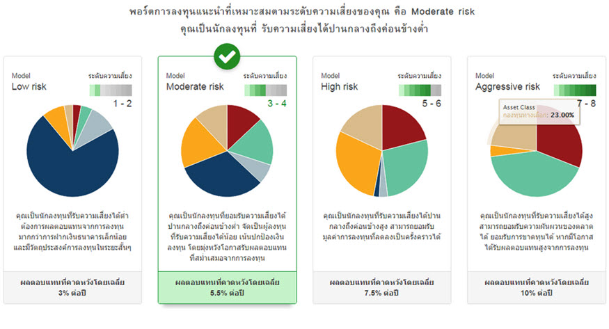ทั้งนี้พอร์ตจำลองทั้ง 4 แบบได้ผ่านกระบวนการ Optimization Allocation (การจัดสรรการลงทุนที่เหมาะสม) ด้วยสมมติฐานจากการนำดัชนีที่เป็นตัวแทนของแต่ละประเภทสินทรัพย์มาหาค่าผลตอบแทนที่คาดหวังและค่าความเสี่ยงที่ควรจะเป็น เพื่อให้ได้มาซึ่งสัดส่วนในแต่ละสินทรัพย์ที่เหมาะสม ขณะที่กองทุนเด่นของแต่ละประเภทสินทรัพย์จะถูกเลือกมาให้เรียบร้อยแล้ว โดยผ่านการคัดเลือกจากทีมบริหารจัดการกองทุนด้วยมุมมองระยะยาว และหากผู้ลงทุนอยากทำการปรับน้ำหนักของแต่ละสินทรัพย์หรือกองทุน หรือเปลี่ยนกองทุน ก็สามารถทำได้ในขั้นตอนที่สอง โดยการลากเมาส์เปลี่ยนกองทุนเข้า/ออกได้อย่างง่ายดาย และในขั้นตอนสุดท้ายนักลงทุนสามารถดูผลตอบแทนและความเสี่ยงของพอร์ตที่แนะนำเปรียบเทียบกับพอร์ตที่ผู้ลงทุนเลือก ซึ่งถ้าหากยังไม่เป็นไปตามที่คาดหวังก็สามารถย้อนกลับไปปรับพอร์ตได้ตามที่ต้องการ