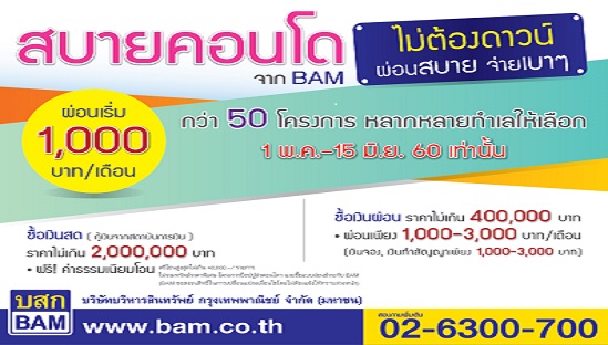 BAM เปิดตัวโครงการ “สบายคอนโด จาก BAM” ซื้อถูกกว่าเช่า ไม่ต้องดาวน์ ผ่อนสบายจ่ายเบา ๆ เริ่มต้นเพียงเดือนละ 1,000 – 3,000 บาท เพื่อช่วยเหลือผู้ซื้อที่มีงบประมาณจำกัด คัดคอนโดหลากหลายทำเลกว่า 2,000 ห้อง พร้อมอัดโปรโมชั่นพิเศษให้กับลูกค้าที่กำลังหาซื้อคอนโดราคาถูก ภายในวันที่ 1 พฤษภาคม – 15 มิถุนายน 2560 เท่านั้น