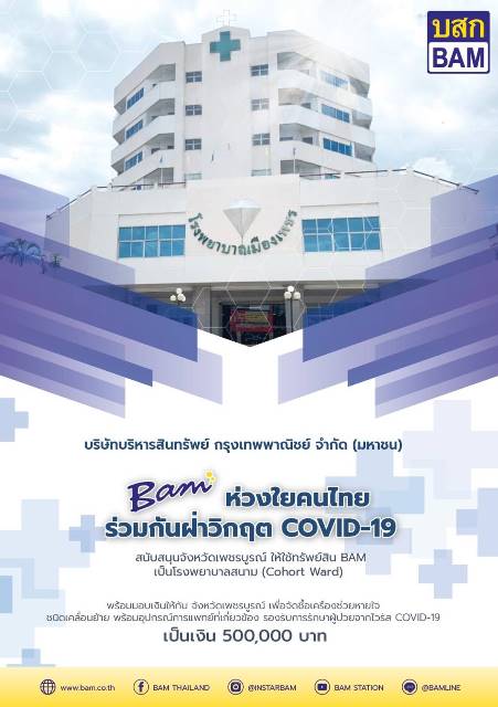 นายสมพร มูลศรีแก้ว กรรมการผู้จัดการใหญ่ บริษัทบริหารสินทรัพย์ กรุงเทพพาณิชย์ จำกัด (มหาชน) หรือ BAM กล่าวว่า จากสถานการณ์แพร่ระบาดของเชื้อไวรัส COVID – 19 ที่ส่งผลกระทบต่อความเป็นอยู่ของประชาชน และภาพรวมของเศรษฐกิจในประเทศขณะนี้ BAM มีความห่วงใยในปัญหาสังคม พร้อมร่วมสนับสนุนให้ประเทศไทยฝ่าวิกฤติ COVID – 19 โดยในวันนี้ (7 เมษายน 2563) BAM ยินดีให้จังหวัดเพชรบูรณ์ ใช้อาคารโรงพยาบาลเมืองเพชร ซึ่งเป็นทรัพย์สินรอการขายของบริษัทฯ จากเดิมเป็นรายการทรัพย์ที่จะนำออกประมูลขายในเดือนเมษายน 2563 นี้ ไปดัดแปลงเป็นโรงพยาบาลสนาม (Cohort Ward) เพื่อรองรับการช่วยชีวิตผู้ป่วยจำนวนมากจากสถานการณ์ระบาดของเชื้อไวรัส COVID – 19 ซึ่งทางจังหวัดเพชรบูรณ์พร้อมเปิดให้บริการทันทีที่เกิดสถานการณ์ฉุกเฉินดังกล่าว โดย BAM ไม่คิดค่าใช้จ่ายใด ๆ ทั้งสิ้น ในการนำทรัพย์สินรอการขายไปใช้ประโยชน์ของทางราชการและประชาชน พร้อมกันนี้ยังได้มอบเงินจำนวน 500,000 บาท ให้กับจังหวัดเพชรบูรณ์ เพื่อใช้ในการจัดซื้อเครื่องช่วยหายใจชนิดเคลื่อนย้าย พร้อมอุปกรณ์การแพทย์ที่เกี่ยวข้อง โดยมี นายสืบศักดิ์ เอี่ยมวิจารณ์ ผู้ว่าราชการจังหวัดเพชรบูรณ์ เป็นผู้รับมอบ
