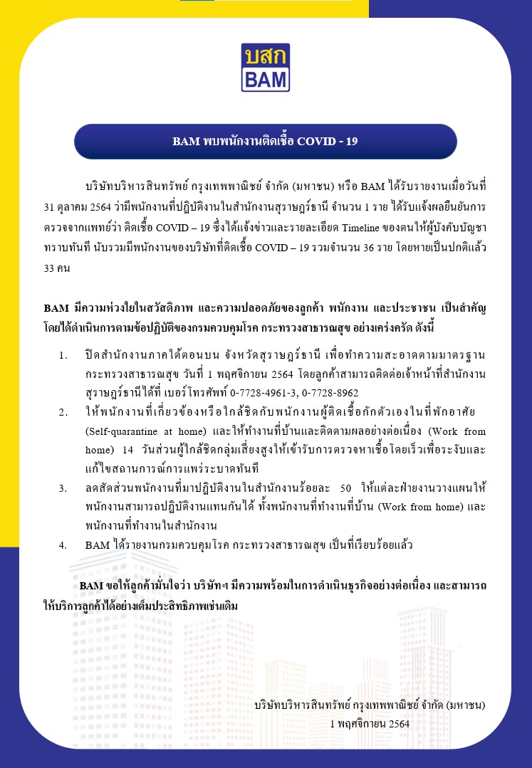 BAM แจ้งพบพนักงาน ติดเชื้อ COVID – 19