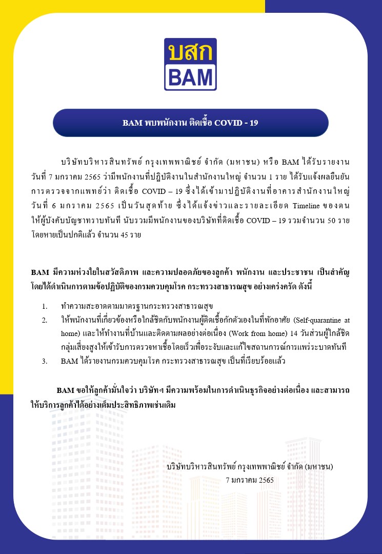 BAM แจ้งพบพนักงาน ติดเชื้อ COVID – 19