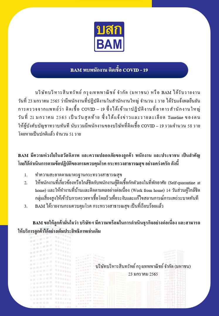 BAM แจ้งพบพนักงาน ติดเชื้อ COVID – 19