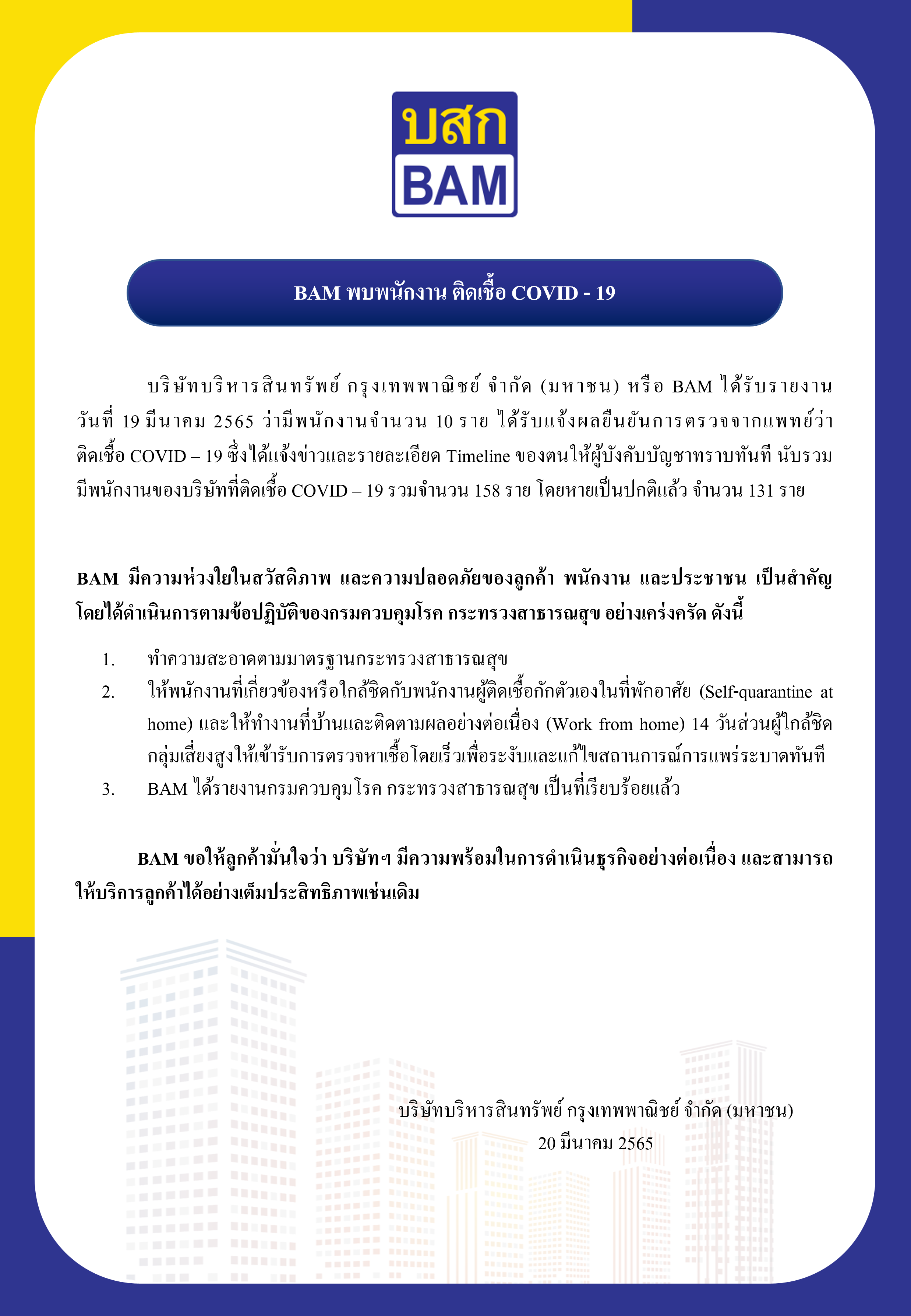 BAM แจ้งพบพนักงาน ติดเชื้อ COVID – 19
