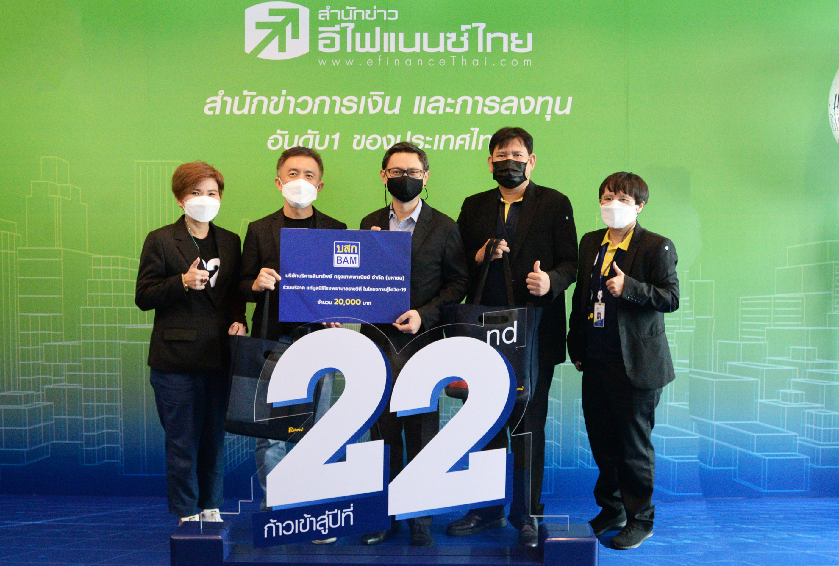 นายวีรเวช ศิริชาติไชย รองผู้จัดการใหญ่ บริษัทบริหารสินทรัพย์ กรุงเทพพาณิชย์ จำกัด (มหาชน) หรือ BAM มอบเงินให้แก่ มูลนิธิโรงพยาบาลราชวิถี ในโครงการ “สู้โควิด-19” จำนวน 20,000 บาท ในโอกาสร่วมแสดงความยินดี ก้าวเข้าสู่ปีที่ 22 ของสำนักข่าวอีไฟแนนซ์ไทย โดยมี นายพรเลิศ เตชะรัตโนภาส ประธานกรรมการบริหาร บริษัท ออนไลน์แอสเซ็ท จำกัด เป็นผู้แทนรับมอบ ณ อาคารอีฟิน เมื่อวันที่ 22 มีนาคม 2565