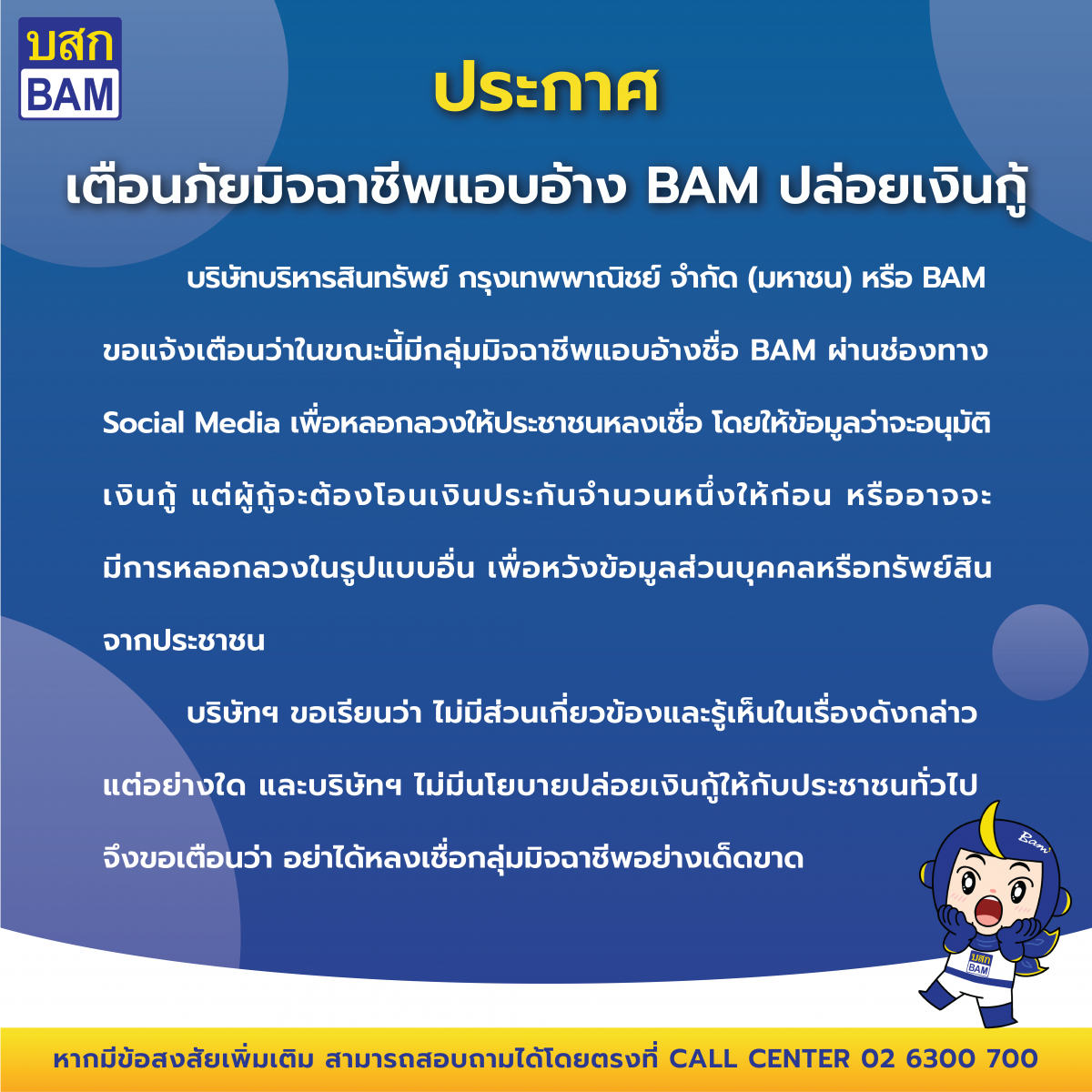 บริษัทบริหารสินทรัพย์ กรุงเทพพาณิชย์ จำกัด (มหาชน) หรือ BAM ขอแจ้งเตือนว่า ในขณะนี้มีกลุ่มมิจฉาชีพแอบอ้างชื่อ BAM ผ่านช่องทาง Social Media เพื่อหลอกลวงให้ประชาชนหลงเชื่อ โดยให้ข้อมูลว่าจะอนุมัติเงินกู้ แต่ผู้กู้จะต้องโอนเงินประกันจำนวนหนึ่งให้ก่อน หรืออาจจะมีการหลอกลวงในรูปแบบอื่น เพื่อหวังข้อมูลส่วนบุคคลหรือทรัพย์สินจากประชาชน