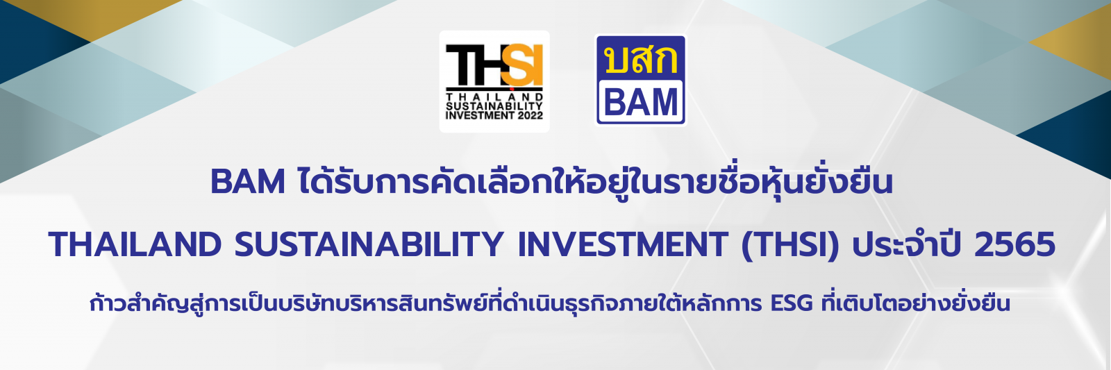 BAM ได้รับคัดเลือกจากตลาดหลักทรัพย์แห่งประเทศไทย ให้เป็นหนึ่งในรายชื่อหุ้นยั่งยืนหรือ Thailand Sustainability Investment (THSI) ประจำปี 2565 ตอกย้ำก้าวสำคัญสู่การเป็นบริษัทบริหารสินทรัพย์ที่เติบโตอย่างยั่งยืน โดยในปีนี้มีบริษัทจดทะเบียนที่ได้รับการคัดเลือกทั้งสิ้น 170 บริษัท