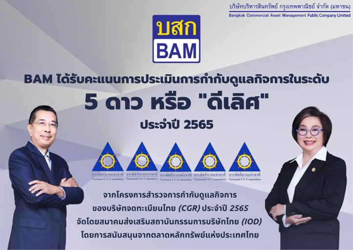 บริษัทบริหารสินทรัพย์ กรุงเทพพาณิชย์ จำกัด (มหาชน) หรือ “BAM” ตอกย้ำความสำเร็จในการดำเนินธุรกิจอย่างมีธรรมาภิบาลและยั่งยืนอย่างต่อเนื่อง โดยในปี 2565 นอกจาก BAM จะได้รับการคัดเลือกให้อยู่ในรายชื่อหุ้นยั่งยืน (THSI) เป็นปีแรก ซึ่งถือเป็นก้าวสำคัญสู่การเป็นบริษัทบริหารสินทรัพย์ที่ดำเนินธุรกิจภายใต้หลักการ ESG ที่เติบโตอย่างยั่งยืนแล้ว เมื่อวันที่ 27 ตุลาคม 2565 BAM ยังได้รับการประเมินการกำกับดูแลกิจการในโครงการสำรวจการกำกับดูแลกิจการบริษัทจดทะเบียนไทย (CGR) อยู่ในระดับ 5 ดาว หรือ “ดีเลิศ” จากสมาคมส่งเสริมสถาบันกรรมการบริษัทไทย (IOD) โดยการสนับสนุนจากตลาดหลักทรัพย์แห่งประเทศไทย (ตลท.) ด้วย โดย BAM ได้รับคะแนนการประเมินสูงถึง 92% สะท้อนให้เห็นถึงความมีศักยภาพในการดำเนินธุรกิจภายใต้วิสัยทัศน์ “เป็นองค์กรหลักในการพลิกฟื้นสินทรัพย์เพื่อช่วยขับเคลื่อนเศรษฐกิจและสังคมไทยให้เติบโตอย่างยั่งยืน” ซึ่งมุ่งเน้นการกำกับดูแลกิจการภายใต้หลักการสิ่งแวดล้อม สังคม ธรรมาภิบาล เพื่อขับเคลื่อนเศรษฐกิจและสังคมอย่างยั่งยืน อันจะส่งผลในการสร้างความเชื่อมั่นในการดำเนินธุรกิจให้กับลูกค้า คู่ค้า/พันธมิตร ผู้ถือหุ้น นักลงทุน และผู้มีส่วนได้เสียในทุกภาคส่วน