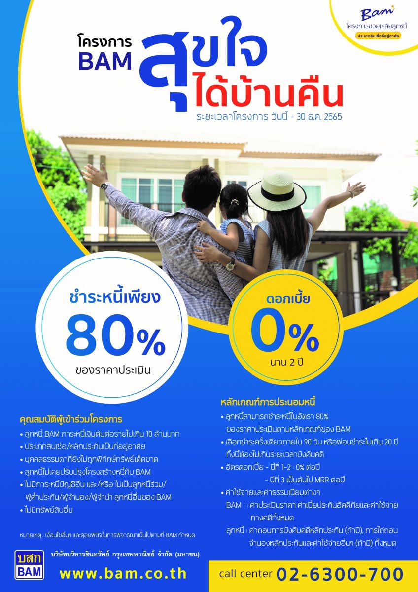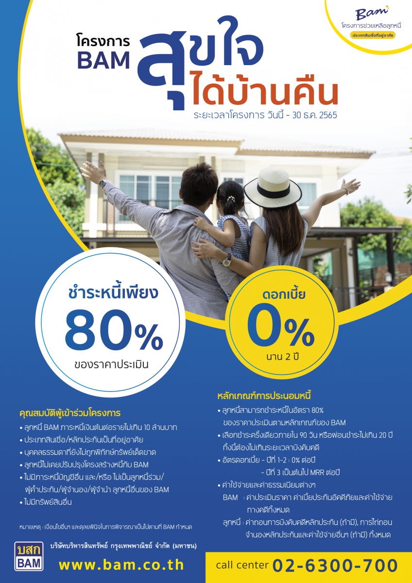 • โครงการสุขใจได้บ้านคืน ลูกหนี้สามารถชำระหนี้ในอัตรา 80% ของราคาประเมิน BAM โดยสามารถเลือกชำระครั้งเดียวภายใน 90 วัน หรือผ่อนชำระไม่เกิน 20 ปี ทั้งนี้ต้องไม่เกินระยะเวลาบังคับคดี