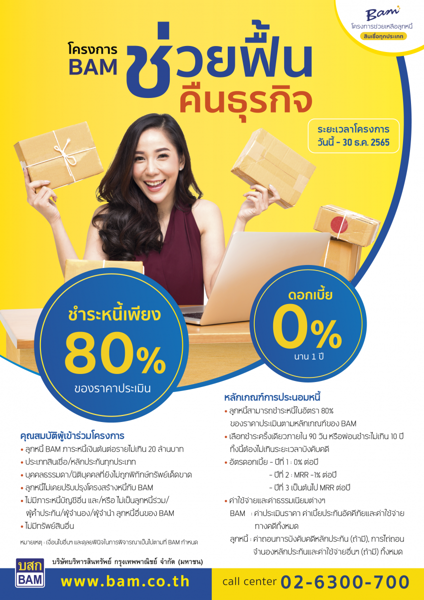 • โครงการ BAM ช่วยฟื้นคืนธุรกิจ ลูกหนี้สามารถชำระหนี้ในอัตรา 80% ของราคาประเมิน BAM โดยสามารถเลือกชำระครั้งเดียวภายใน 90 วัน หรือผ่อนชำระไม่เกิน 10 ปี ทั้งนี้ต้องไม่เกินระยะเวลาบังคับคดี