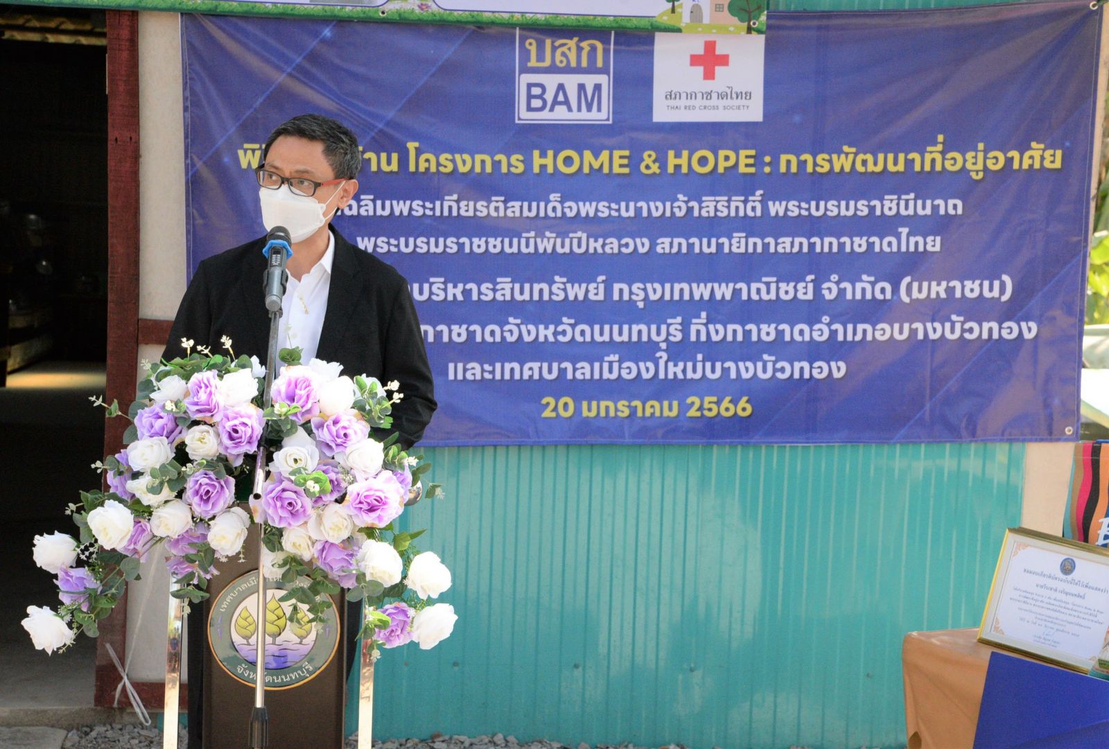 นายวีรเวช ศิริชาติไชย รองผู้จัดการใหญ่ สายสนับสนุนองค์กร นายจำรูญ กสิวัตร์ ผู้จัดการฝ่ายพัฒนาสินทรัพย์นนทบุรี และพนักงาน บริษัทบริหารสินทรัพย์ กรุงเทพพาณิชย์ จำกัด (มหาชน) หรือ BAM พร้อมด้วย นายไพโรจน์ จึงธนาเจริญ นายอำเภอบางบัวทอง นางกิ่งแก้ว จึงธนาเจริญ นายกกิ่งกาชาดอำเภอบางบัวทอง นายวีระชาติ เจริญนนทสิทธิ์ นายกเทศมนตรีเมืองใหม่บางบัวทอง และสมาชิกเทศบาลเมืองใหม่บางบัวทอง ร่วมส่งมอบบ้าน BAM “ โครงการ HOME & HOPE : การพัฒนาที่อยู่อาศัย เฉลิมพระเกียรติสมเด็จ พระนางเจ้าสิริกิติ์ พระบรมราชินีนาถ พระบรมราชชนนี พันปีหลวง สภานายิกาสภากาชาดไทย ” ให้แก่ นายสนิท ปานปิ่น ณ ตำบลบางบัวทอง อำเภอบางบัวทอง จังหวัดนนทบุรี เพื่อสนับสนุนให้เกิดการแก้ไขปัญหาที่อยู่อาศัย ด้วยการปลูกสร้างบ้านที่มั่นคงและปลอดภัยให้กับผู้ด้อยโอกาส ช่วยเหลือสังคมให้เกิดการพัฒนาอย่างยั่งยืนต่อไป