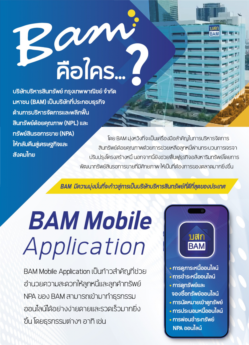 BAM ประกอบธุรกิจด้านการบริหารจัดการสินทรัพย์ด้อยคุณภาพ โดยมีส่วนช่วยเหลือลูกหนี้และแก้ไขปัญหาสถาบันการเงิน เพิ่มเติม