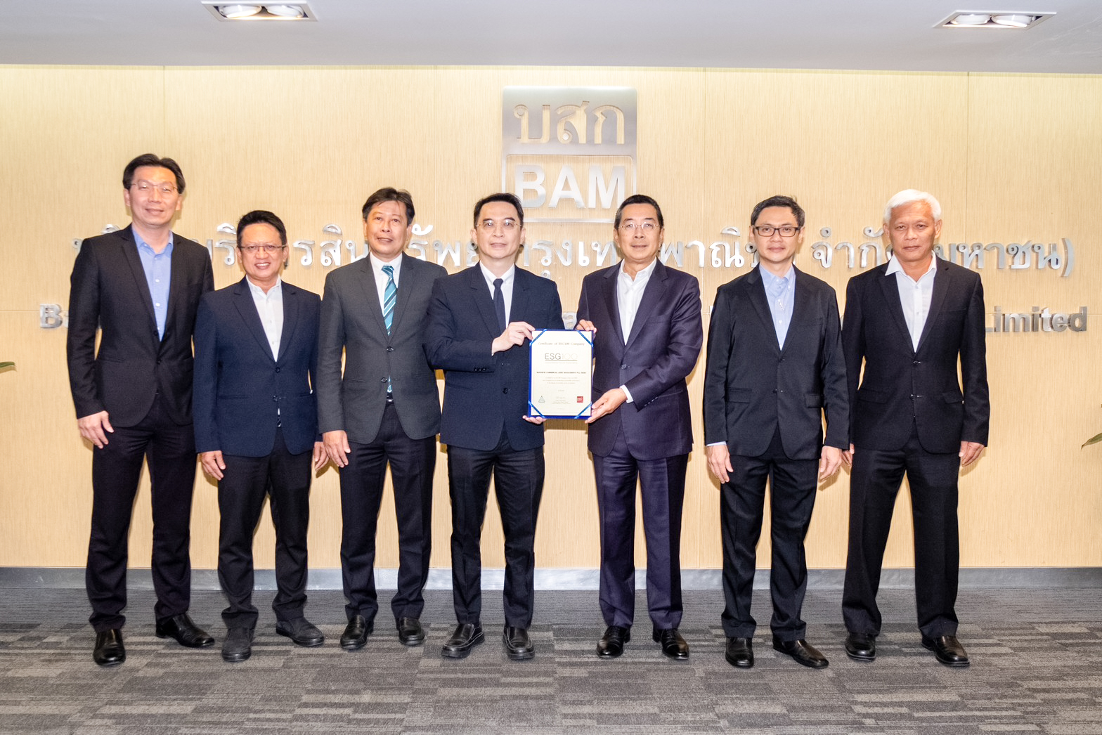 นายบัณฑิต อนันตมงคล (ที่ 5 จากซ้าย) ประธานเจ้าหน้าที่บริหาร บริษัทบริหารสินทรัพย์ กรุงเทพพาณิชย์ จำกัด (มหาชน) หรือ BAM พร้อมด้วยผู้บริหาร ร่วมรับมอบประกาศนียบัตรจากสถาบันไทยพัฒน์ ในโอกาสได้รับการคัดเลือกให้อยู่ในกลุ่มหลักทรัพย์ ESG100 โดย ดร.พิพัฒน์ ยอดพฤติการ (ที่ 4 จากซ้าย) ประธานสถาบันไทยพัฒน์