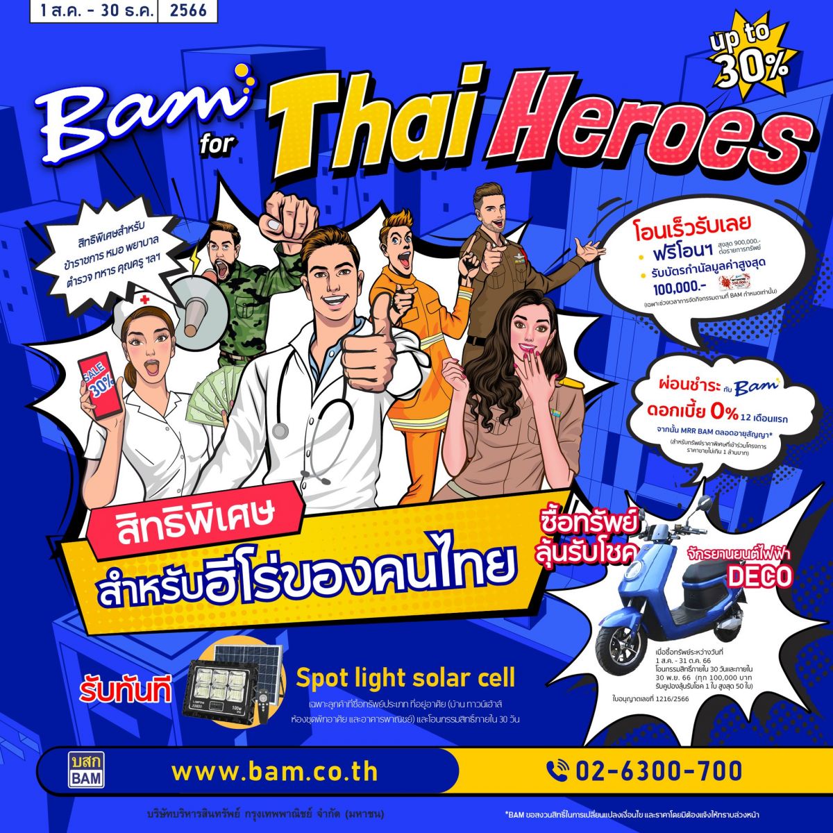 BAM จัดแคมเปญ เพื่อฮีโร่ของคนไทย BAM for Thai Heroes แทนคำขอบคุณบุคลากรทางการแพทย์ ทางการศึกษา ตำรวจ ทหาร อสม. ทั่วประเทศ ตั้งแต่วันนี้ - 30 ธันวาคม 2566 คัดทรัพย์คุณภาพ ทำเลดี มีให้เลือกทั้ง บ้าน ที่ดิน คอนโด และอสังหาฯ เพื่อการลงทุนจำนวนกว่า 1,500 รายการ อัดโปรแรงลดราคากระหน่ำสูงสุด 30% แบบลดแล้วลดอีก พร้อมโปรโมชั่น “ลดให้ ได้ฟรี มีลุ้น” รับสิทธิพิเศษเพียบ