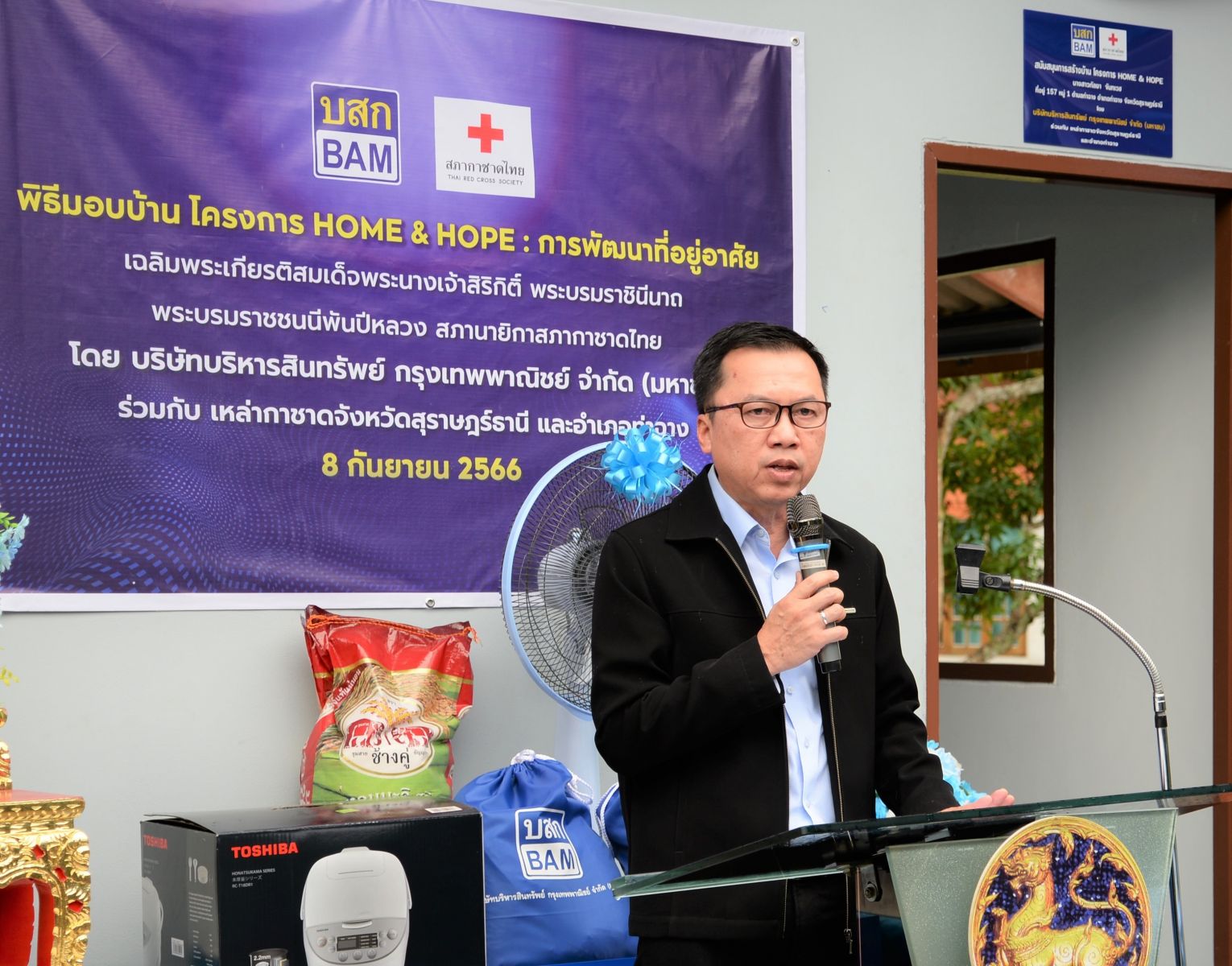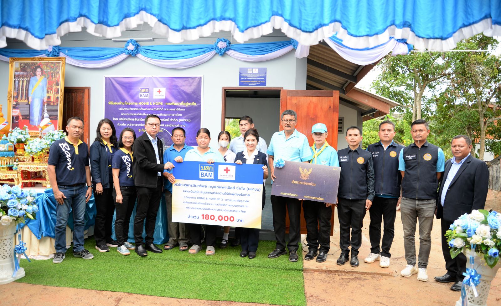 นายวุฒิพงศ์ บุญยะสิทธิ์ ผู้อำนวยการฝ่ายพัฒนาสินทรัพย์ภาคใต้ตอนบน นางวนิดา ณ สุโหลง ผู้จัดการสำนักงานสุราษฎร์ธานี ผู้บริหารและพนักงานบริษัทบริหารสินทรัพย์ กรุงเทพพาณิชย์ จำกัด (มหาชน) หรือ BAM พร้อมด้วย นางอุรสา จินโต นายกเหล่ากาชาดจังหวัดสุราษฎร์ธานี นายสุกิจ มีพริ้ง นายอำเภอท่าฉาง และองค์กรปกครองส่วนท้องถิ่น ร่วมส่งมอบบ้าน BAM “ โครงการ HOME & HOPE : การพัฒนาที่อยู่อาศัย เฉลิมพระเกียรติสมเด็จพระนางเจ้าสิริกิติ์ พระบรมราชินีนาถพระบรมราชชนนีพันปีหลวง สภานายิกาสภากาชาดไทย ” ต่อเนื่องเป็นปีที่ 3 ให้แก่ นางสาวกัลยา จันทเวช ตำบลท่าฉาง อำเภอท่าฉาง จังหวัดสุราษฎร์ธานี