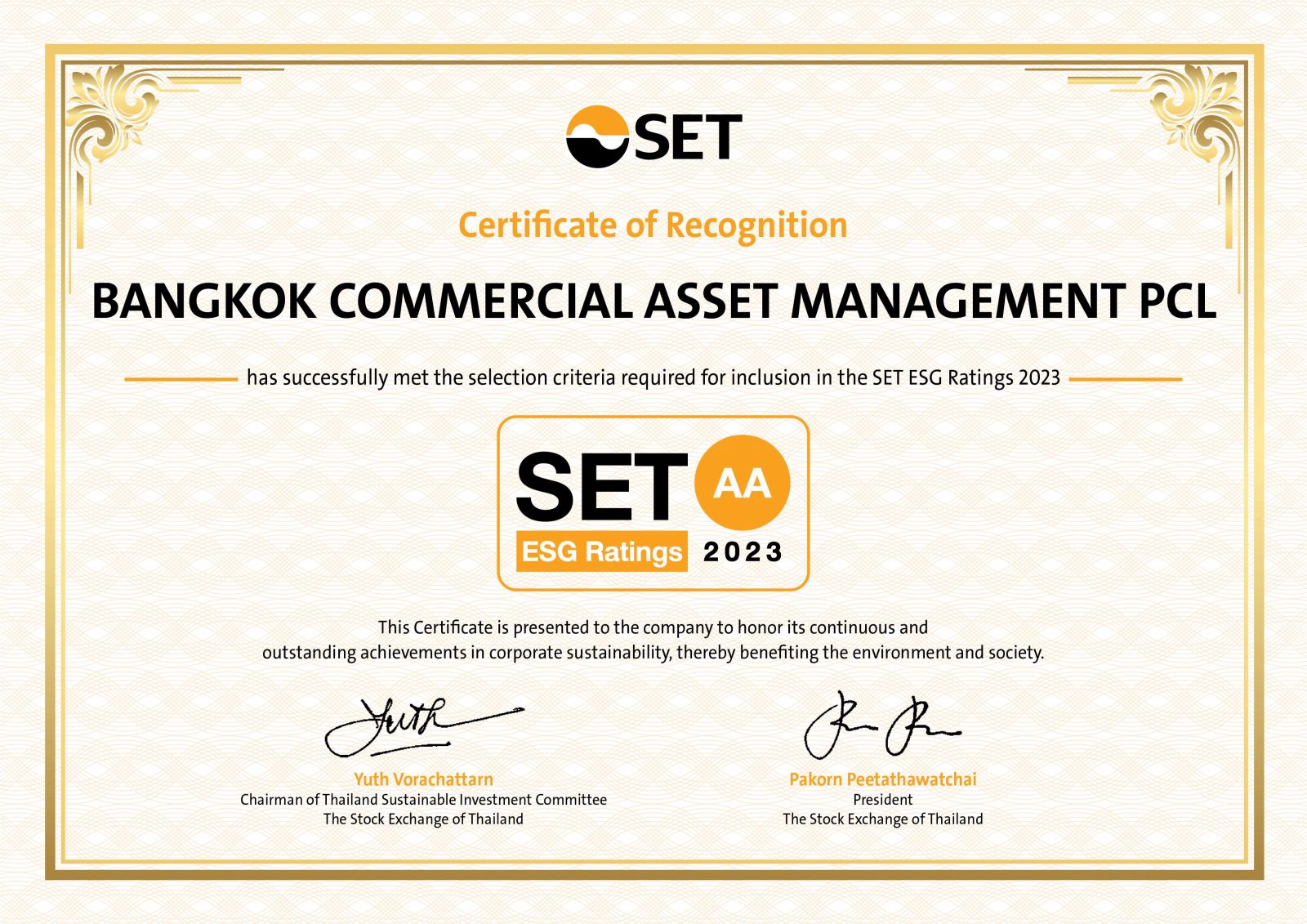 บริษัทบริหารสินทรัพย์ กรุงเทพพานิชย์ จำกัด (มหาชน) หรือ BAM ได้รับการประเมินหุ้นยั่งยืน “SET ESG Rating” ในระดับ AA ประจำปี 2566 จากตลาดหลักทรัพย์แห่งประเทศไทย โดยเป็น 1 ใน 193 บริษัทจดทะเบียนที่ได้รับการประกาศผลประเมินหุ้นยั่งยืน SET ESG Ratings สะท้อนให้เห็นว่า BAM ให้ความสำคัญต่อการดำเนินธุรกิจอย่างยั่งยืน โดยยกระดับการดำเนินงานและการจัดทำรายงานความยั่งยืนภายใต้กรอบ ESG (Environmental, Social and Governance) ในมิติเศรษฐกิจ มิติธรรมาภิบาล มิติสิ่งแวดล้อม มิติผู้คนและสิทธิมนุษยชน เป็นบริษัทที่มีการนำแนวคิดด้านความยั่งยืนเข้าเป็นส่วนหนึ่งในกระบวนการดำเนินธุรกิจ อีกทั้งพร้อมรับมือกับปัจจัยการเปลี่ยนแปลงด้านสังคมและสิ่งแวดล้อมและให้ความสำคัญ กับผู้มีส่วนได้เสียทุกภาคส่วนได้อย่างสมดุล