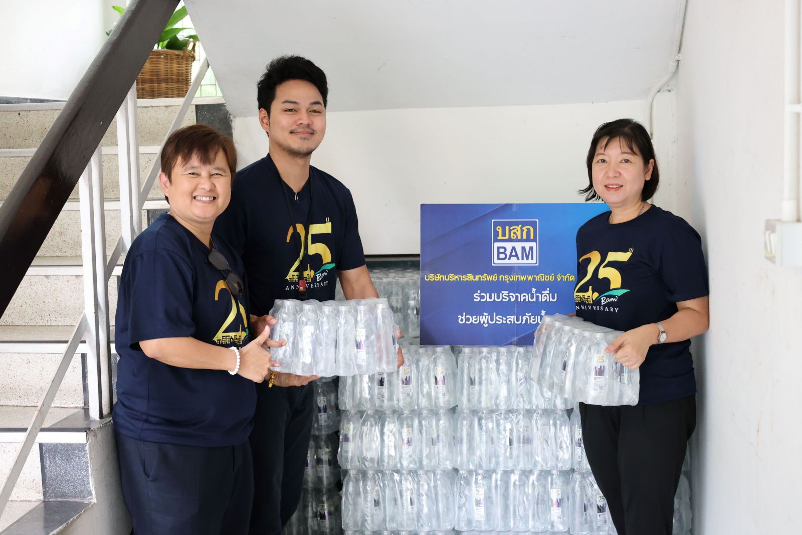 นายดนัย ด้วงเจริญ ผู้อำนวยการฝ่ายสื่อสารองค์กรและนักลงทุนสัมพันธ์ พร้อมพนักงาน บริษัทบริหารสินทรัพย์ กรุงเทพพาณิชย์ จำกัด (มหาชน) หรือ BAM มอบน้ำดื่ม จำนวน 1,800 ขวด ให้กับนางธราพร อำนวยสาร ผู้อำนวยการเขตบางรัก เพื่อส่งต่อความช่วยเหลือ ไปยังผู้ประสบภัยน้ำท่วมในพื้นที่ต่างๆ ต่อไป