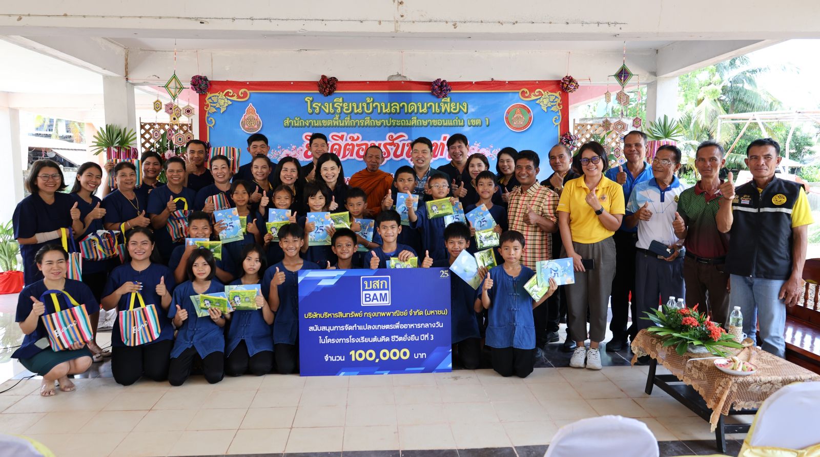 นางสาวจิราพร ประเสริฐศรี ผู้อำนวยการฝ่ายพัฒนาสินทรัพย์ภาคตะวันออกเฉียงเหนือ บริษัทบริหารสินทรัพย์ กรุงเทพพาณิชย์ จำกัด (มหาชน) หรือ BAM พร้อมด้วยผู้บริหารและพนักงาน ร่วมมอบเงิน ในโครงการโรงเรียนต้นคิด ชีวิตยั่งยืน จำนวน 100,000 บาท ให้กับโรงเรียนบ้านลาดนาเพียง อำเภอเมือง จังหวัดขอนแก่น โดยมี นายวชิรวิทย์ สุราสา ผู้อำนวยการโรงเรียน และคณะครู คณะกรรมการสถานศึกษาฯ นายกองค์การบริหารส่วนท้องถิ่น ร่วมรับมอบ พร้อมกันนี้ยังได้มอบชุดเครื่องเขียน และสมุด BAM ในโอกาสครบรอบ 25 ปี จำนวน 400 เล่ม ให้กับนักเรียน