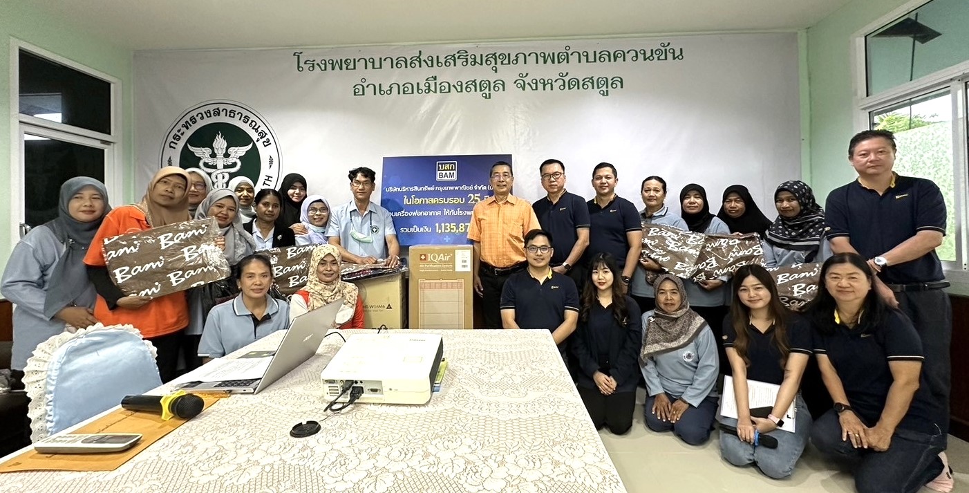 นายบัณฑิต อนันตมงคล ประธานเจ้าหน้าที่บริหาร บริษัทบริหารสินทรัพย์ กรุงเทพพาณิชย์ จำกัด (มหาชน) หรือ BAM นายวุฒิพงศ์ บุญยะสิทธิ์ ผู้อำนวยการฝ่ายพัฒนาสินทรัพย์ภาคใต้ตอนบน และรักษาการผู้อำนวยการฝ่ายพัฒนาสินทรัพย์ภาคใต้ตอนล่าง นายพะโยม แก้วบรรดาล ผู้จัดการสำนักงานนครศรีธรรมราช นายสุวิทย์ ขอตั้งภักดี ผู้จัดการสำนักงานยะลา นายชวลิต เหมทานนท์ ผู้จัดการสำนักงานหาดใหญ่ พร้อมพนักงาน บริษัทบริหารสินทรัพย์ กรุงเทพพาณิชย์ จำกัด (มหาชน) หรือ BAM มอบเครื่องฟอกอากาศ IQ Air รุ่น HealthPro 250 ให้กับโรงพยาบาลเขตพื้นที่ภาคใต้ตอนล่าง 3 แห่ง ได้แก่ โรงพยาบาลลานสกา จ.นครศรีธรรมราช โรงพยาบาลส่งเสริมสุขภาพตำบลควนขัน จ.สตูล และโรงพยาบาลส่งเสริมสุขภาพตำบลสะเตงนอก จ.ยะลา เพื่อเพิ่มประสิทธิภาพการกรองอากาศ ลดปัญหาผลกระทบจาก PM 2.5 ลดสารก่อภูมิแพ้ และเชื้อโรคทางอากาศ ส่งเสริมสุขอนามัยและความปลอดภัยของบุคลากรทางการแพทย์รวมทั้งผู้ป่วยภายในโรงพยาบาล