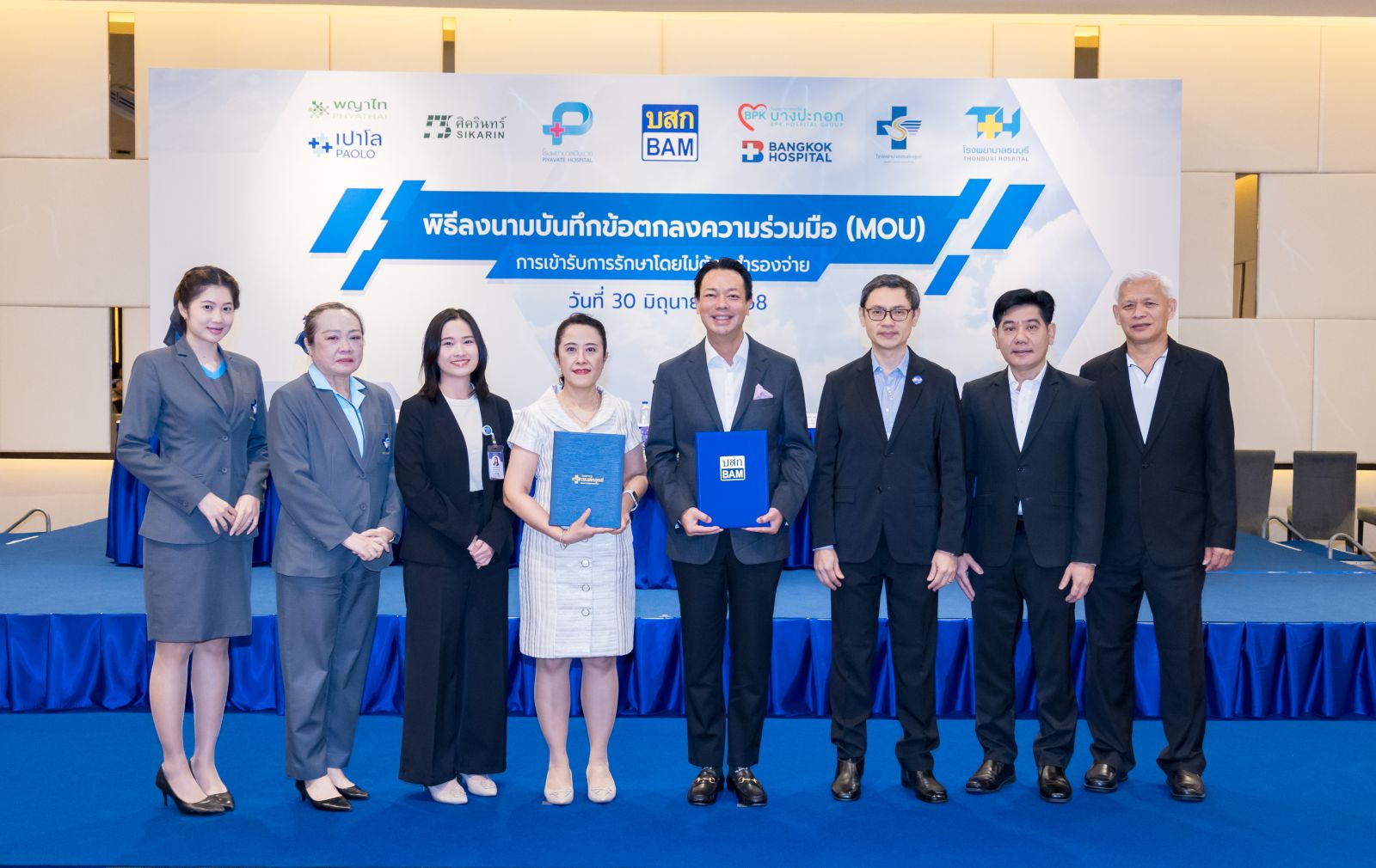 วันนี้ (30 มิ.ย. 68) บริษัทบริหารสินทรัพย์ กรุงเทพพาณิชย์ จำกัด (มหาชน) หรือ BAM ได้ลงนามบันทึกข้อตกลงทางความร่วมมือ (MOU) กับ 8 โรงพยาบาลใหญ่และโรงพยาบาลในเครือ รวมทั้งสิ้น 24 โรงพยาบาล ประกอบด้วยโรงพยาบาลกรุงเทพ (สำนักงานใหญ่) โรงพยาบาลธนบุรี 1 โรงพยาบาลบางปะกอก 1, 3, 8, 9 อินเตอร์เนชั่นแนล, รังสิต 2 และสมุทรปราการ โรงพยาบาลพญาไท 1, 2, 3, ศรีราชา, นวมินทร์ และพหลโยธิน โรงพยาบาลเซนต์หลุยส์ โรงพยาบาลเปาโลรังสิต, เกษตร, พระประแดง, สมุทรปราการ และโชคชัย 4 โรงพยาบาลศิครินทร์ลาซาล สมุทรปราการ และหาดใหญ่ โรงพยาบาลปิยะเวท เพื่อให้พนักงานสามารถเข้ารักษาในโรงพยาบาลโดยไม่ต้องสำรองจ่าย พร้อมส่วนลดต่างๆ เช่น ค่ายา ค่าห้อง 5-10% เป็นต้น