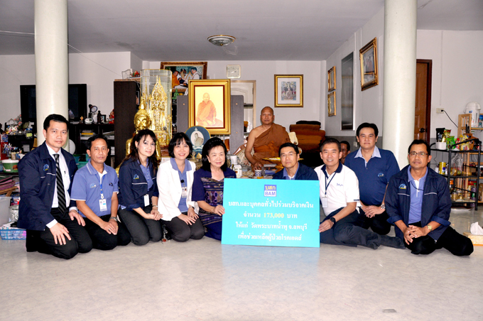 เมื่อวันที่ 29 พฤศจิกายน 2553 ที่ผ่านมา นางสว่างจิตต์ จัยวัฒน์ ประธานกรรมการ บริษัทบริหารสินทรัพย์ เป็นตัวแทนผู้บริหาร พนักงาน และบุคคลทั่วไป บริจาคเงินให้แก่วัดพระบาทน้ำพุ จ.ลพบุรี เพื่อช่วยเหลือผู้ป่วยโรคเอดส์ จำนวนเงินรวม 173,000 บาท