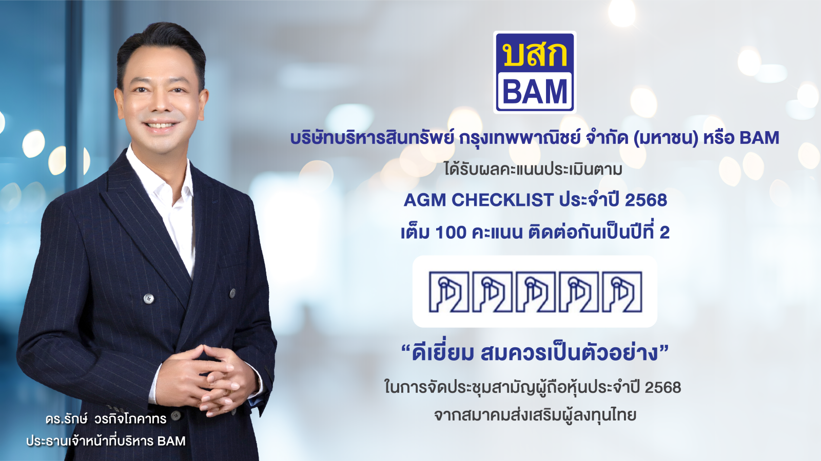 ดร.รักษ์ วรกิจโภคาทร ประธานเจ้าหน้าที่บริหาร บริษัทบริหารสินทรัพย์ กรุงเทพพาณิชย์ จำกัด (มหาชน) หรือ BAM กล่าวว่า BAM ได้รับคะแนนประเมินคุณภาพการจัดประชุมสามัญผู้ถือหุ้น 100 คะแนนเต็ม (5 เหรียญ) หรือระดับ “ดีเยี่ยม สมควรเป็นตัวอย่าง” จากโครงการประเมินคุณภาพ การจัดประชุมสามัญผู้ถือหุ้น ประจำปี 2568 (AGM Checklist) ของบริษัทจดทะเบียนในตลาดหลักทรัพย์แห่งประเทศไทย จัดขึ้นโดยสมาคมส่งเสริมผู้ลงทุนไทย และสภาธุรกิจตลาดทุนไทย