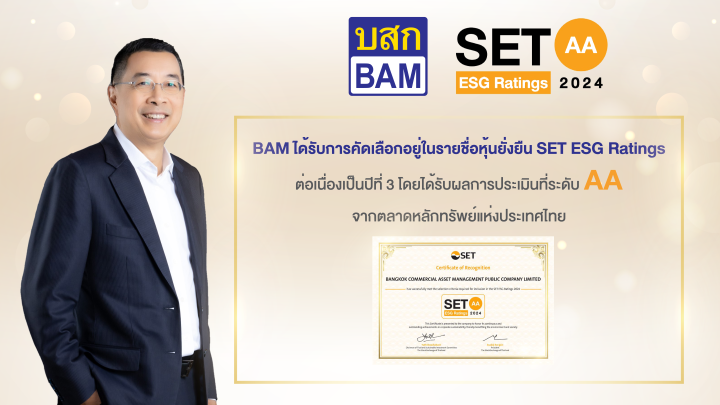 BAM ได้รับการประเมินหุ้นยั่งยืน “SET ESG Rating” ในระดับ AA ประจำปี 2567...